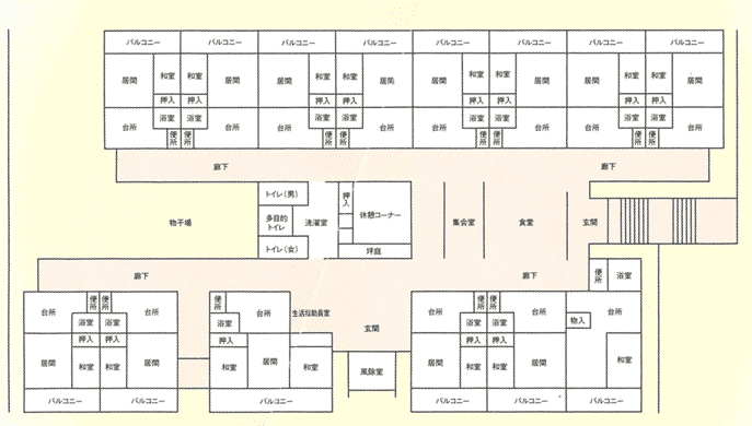 管理室/生活援助員室/食堂/集会室(談話室)/休憩室(和室)/洗濯室/共用トイレ/車椅子用トイレ/駐車場/駐輪場/ナースコール/血圧計/汚物処理室/防災設備/避難設備/車椅子対応のリフトカー